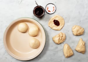 4. Weigh the dough, and cut it into eight even pieces. Flatten each (not too thinly in the centre, or the dough might split), place a teaspoon of plum jam into the centre, and pull the edges up. Pinch them together, then flip the ball and roll it on the work surface. Place each in the greased oven dish, not quite touching the others. Allow to proof for around 40 minutes, enough to let the rolls join up, and until they bounce back when prodded.